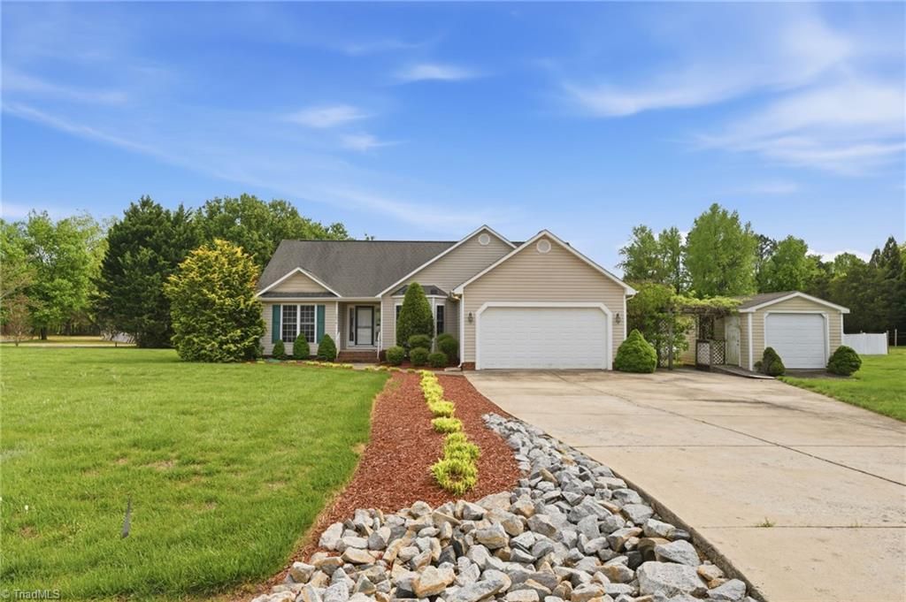 Great Home in Great Location in Grays Chapel/Providence Grove district! 3BR/2BA ranch with 1,500+ SF and split bedroom floor plan. Spacious great room with gas log fireplace, crown moulding throughout, formal dining room, and eat-in kitchen with plenty of cabinet space. The primary suite offers a vaulted ceiling, dual closets, and a bath with double vanities, an oversized tub, and a separate shower. One-level living with a separate utility room and excellent storage, including attic space over a spacious garage. Beautiful natural landscaping, extra-wide driveway with additional parking pad. Enjoy the sun porch filled with natural light and peaceful bird and wildlife views, plus a deck overlooking a private fenced backyard. Detached workshop and whole-house backup generator add exceptional value.